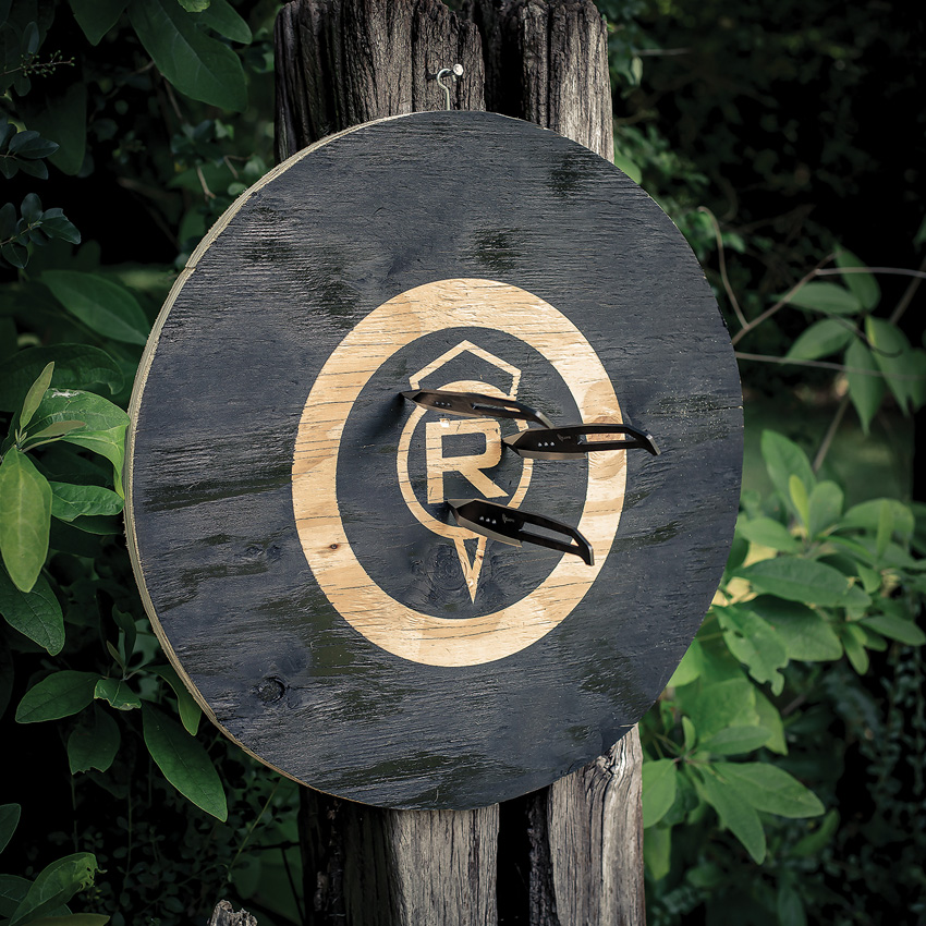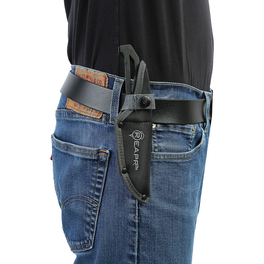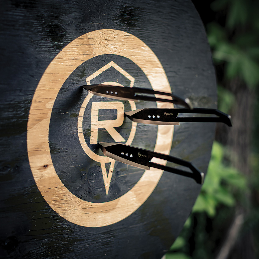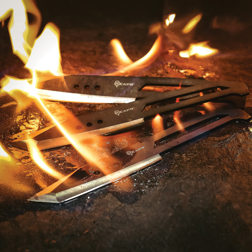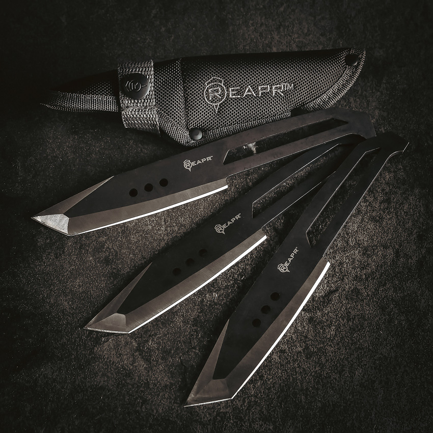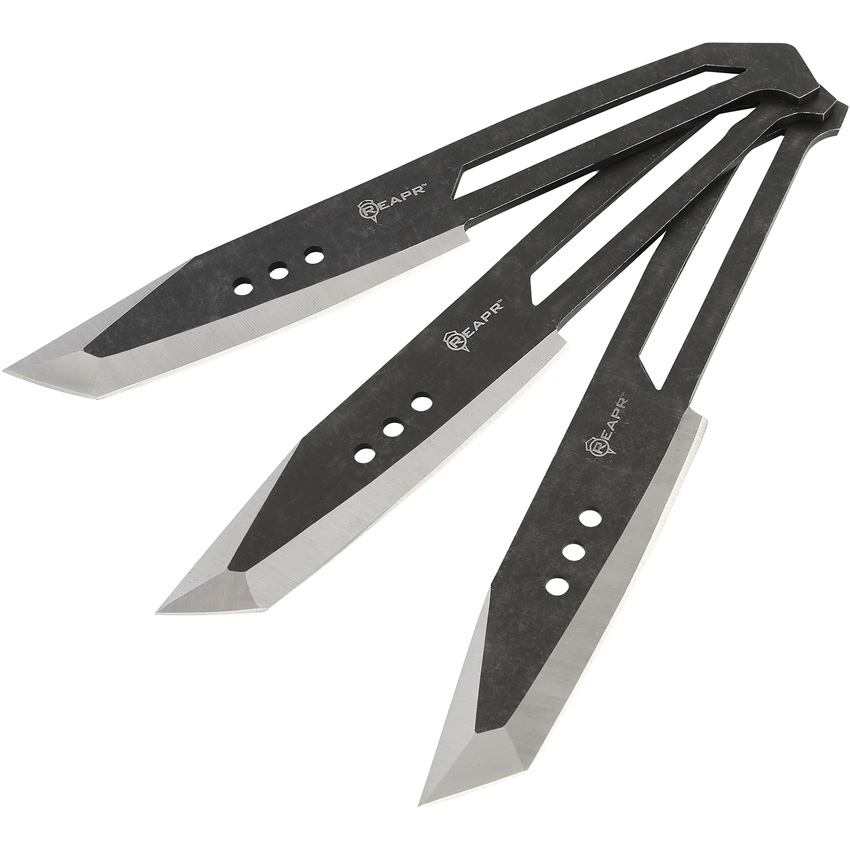 8″ (20.32cm) overall. 4.25″ (10.8cm) stonewash finish 420 stainless tanto blade. One-piece construction. Set of three. Balanced design for accurate throwing. Black ballistic nylon belt sheath. Clam packed.