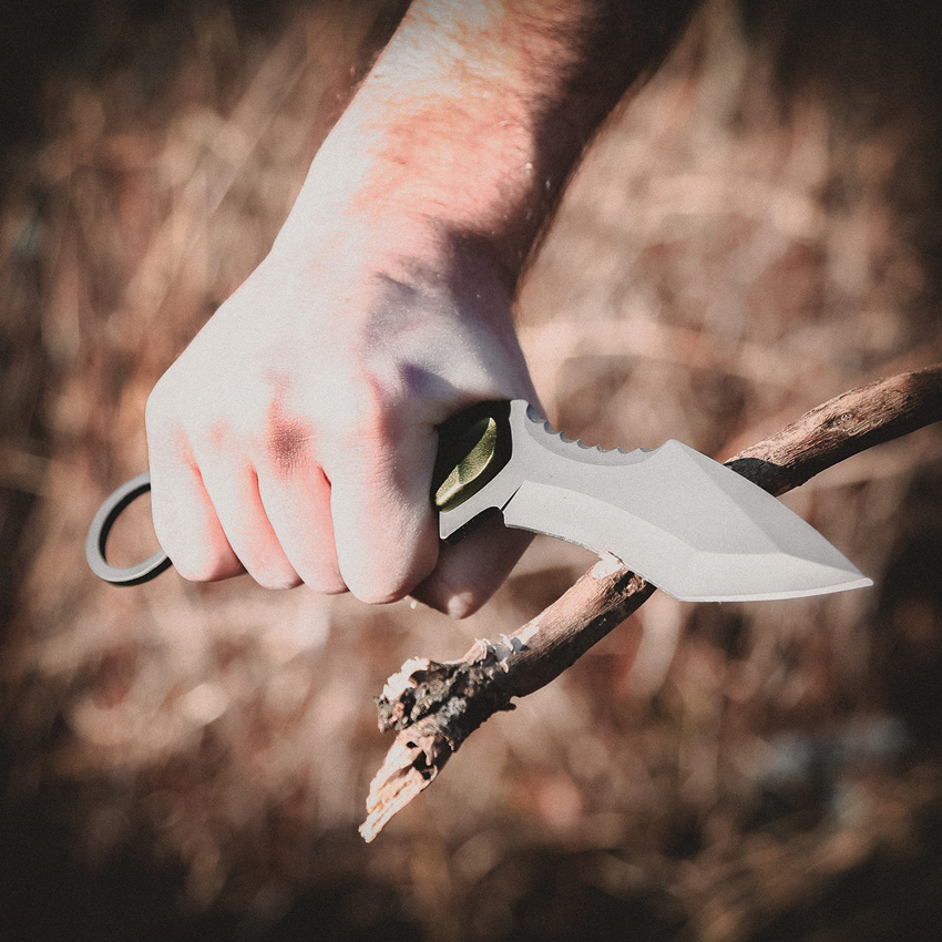 10.25″ (26.04cm) overall. 4.75″ (12.07cm) matte finish sawback 420 stainless modified spear point blade. Green sculpted aluminum handle. Bottle opener. Finger ring. Black ballistic nylon belt sheath. Clam packed.