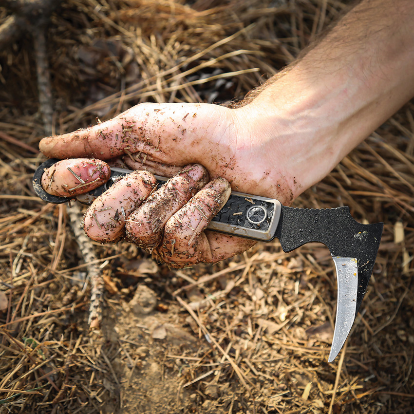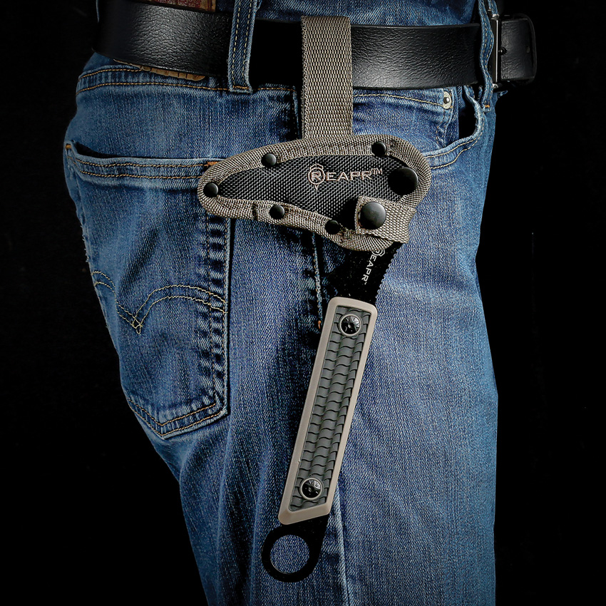 8.5″ (21.59cm) overall. 3.5″ (8.89cm) black powder coated 420 stainless karambit blade. Black and tan TPR handle. Full, extended tang. Finger ring. Tan ballistic cloth MOLLE compatible belt sheath. Clam packed.