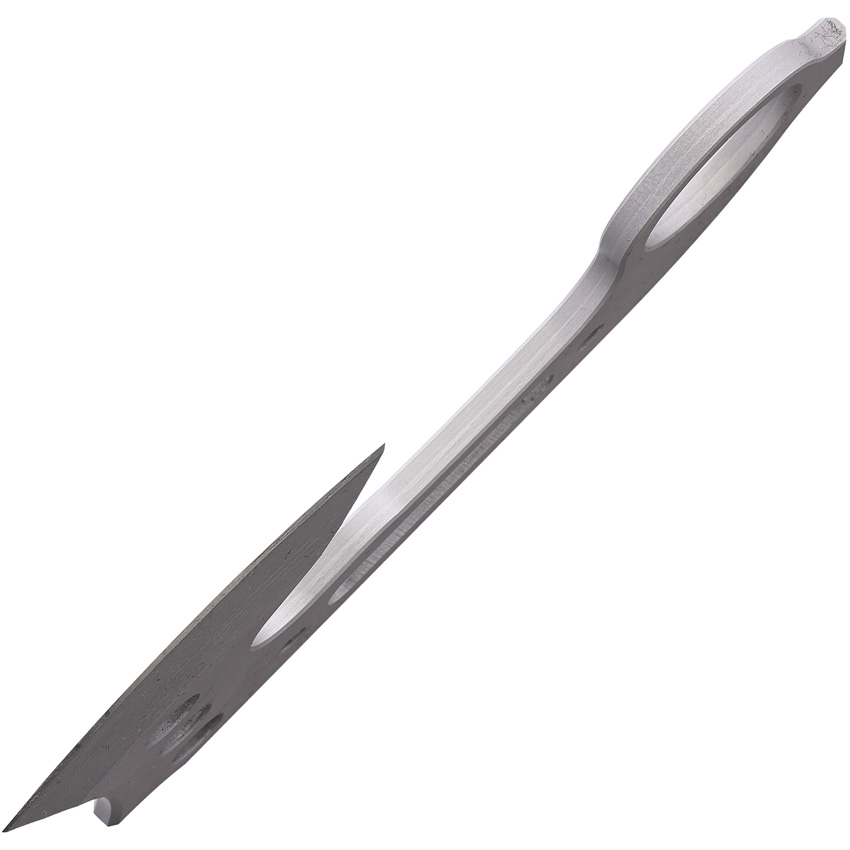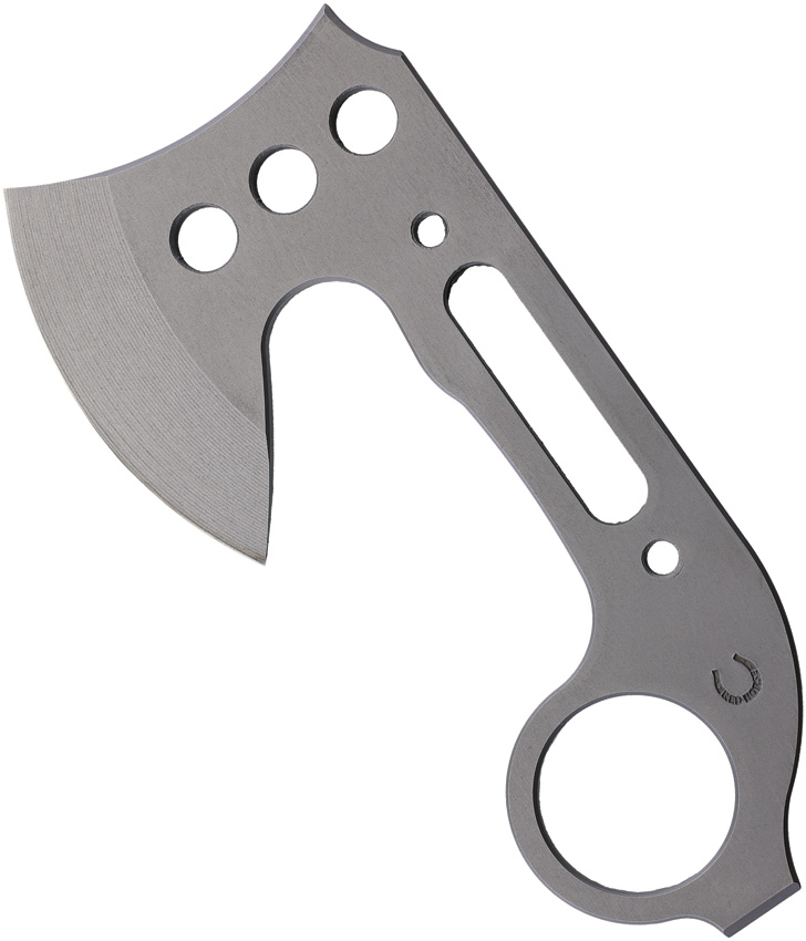 6″ overall. 2.75″ stonewash finish D2 tool steel axe head with 2.75″ cutting edge. One-piece construction. Finger ring. Weight: 1lb. 0.187″ thick. Pry bar end. Barebones edition. Black Kydex belt sheath. Boxed.