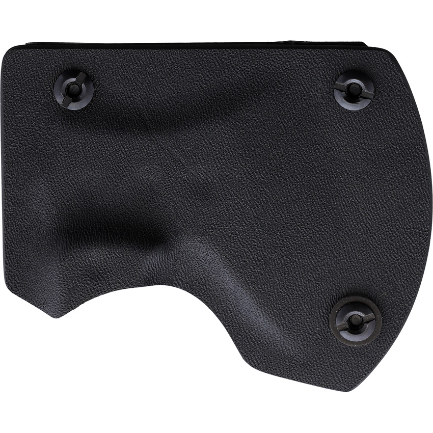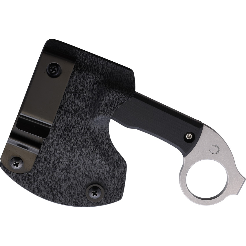 6″ overall. 2.75″ stonewash finish D2 tool steel axe head with 2.75″ cutting edge. Black G10 handle. Finger ring. Full, extended tang. Weight: 1lb. 0.187″ thick. Pry bar end. Black Kydex belt sheath. Boxed.