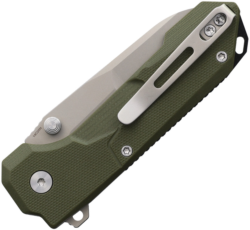 4″ (10.16cm) closed. 2.88″ (7.32cm) sand blast finish flat ground 14C28N Sandvik stainless drop point blade. OD green G10 handle. Thumb disk. Pocket clip. Lanyard hole. Extended tang. Black nylon zippered storage case. Boxed.