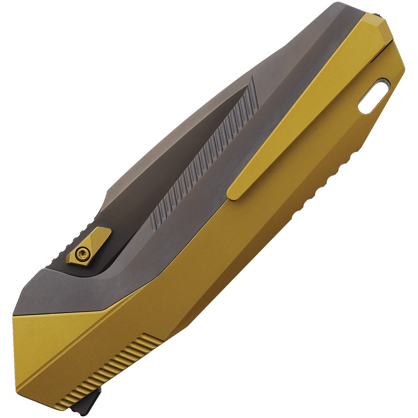 4.75″ (12.07cm) closed. 3.5″ (8.89cm) black DLC coated Bohler M390 stainless drop point blade. Black and gold titanium handle. Extended tang. Lanyard hole. Pocket clip. Boxed.