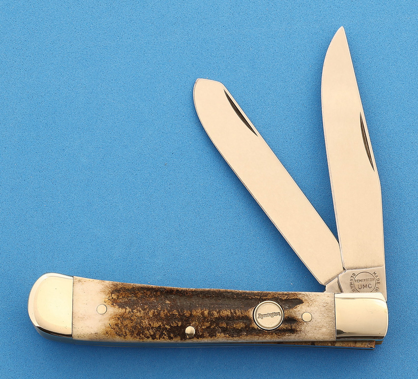 Remington Genuine Stag Trapper. 4 1/8” closed 2 blade. Clip point and long spey blades. Genuine deer stag handles with nickel silver bolsters and Remington headstamp inlay shield. Produced in USA by Camilus Cutlery. Original cardboard gift box.