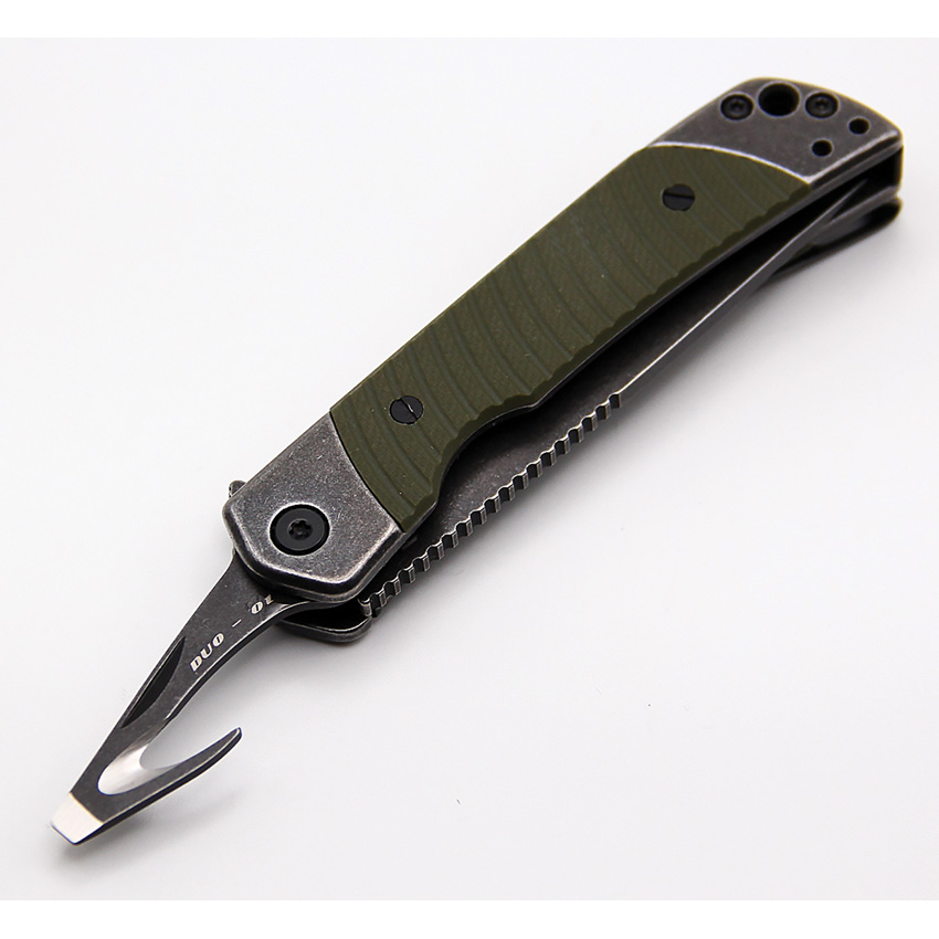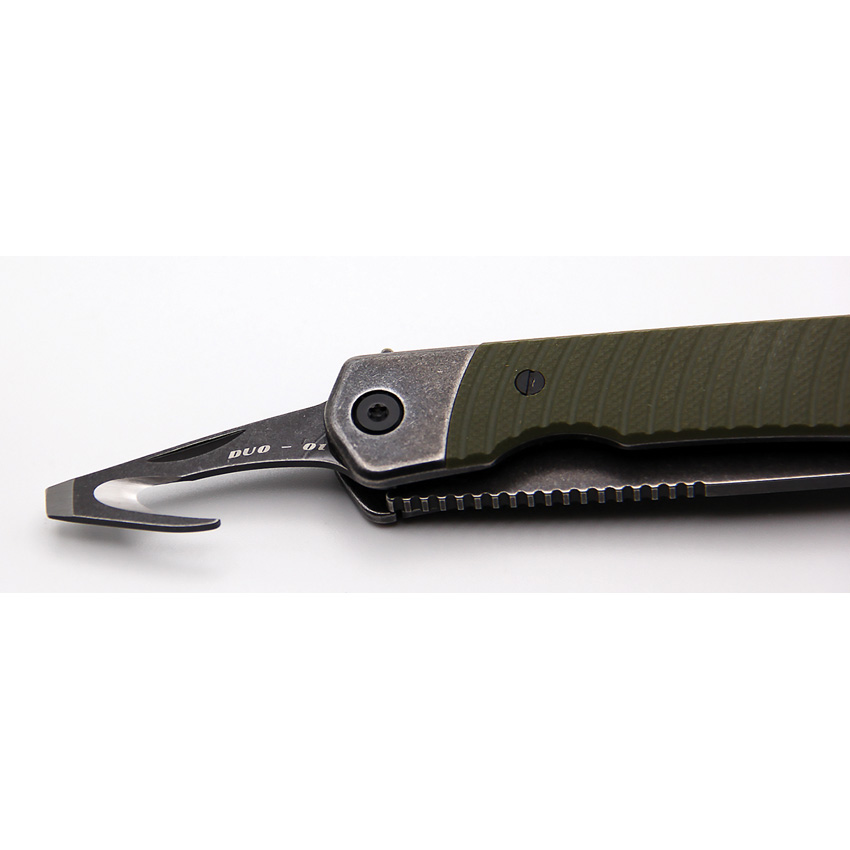 3.88″ (9.86cm) closed. Black stonewash finish 9Cr18MoV stainless drop point and guthook blades. OD green G10 handle. Stainless bolster(s). Lanyard hole. Pocket clip. Clam packed.