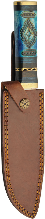 12.75″ (32.39cm) overall. 7.25″ (18.42cm) satin finish stainless blade. Blue sculpted wood handle. Brass guard and pommel. Brown leather belt sheath. Boxed.