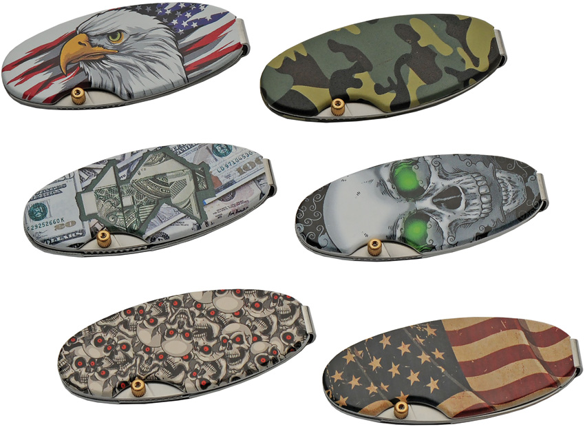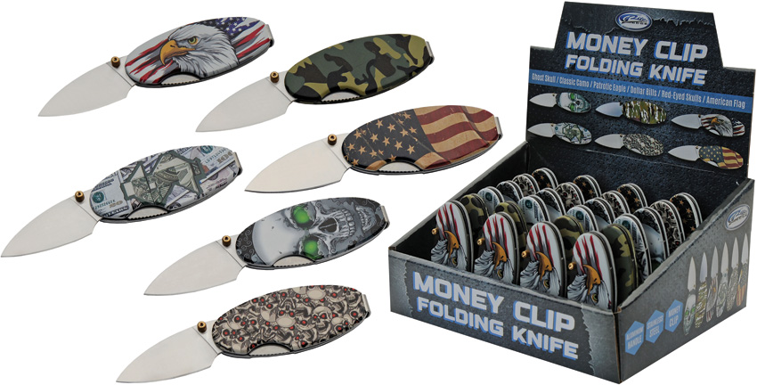 2.75″ (6.99cm) closed. 1.75″ (4.45cm) satin finish stainless blade. Aluminum handle. 24 pieces. Four of each handle pattern (Ghost skull, Classic camo, Patriotic eagle, Dollar bill, Red-eyed skulls, American flag). Comes in cardboard countertop display box. Boxed.
