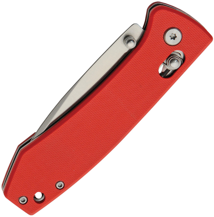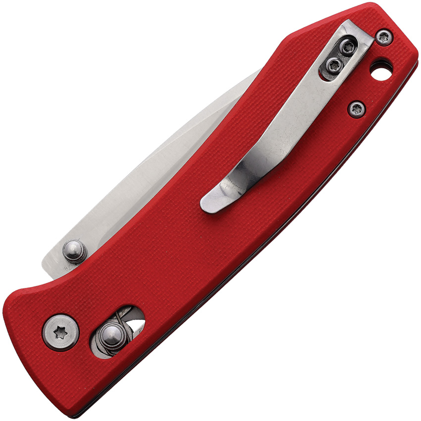 4.25″ (10.8cm) closed. 3.25″ (8.26cm) satin finish 8Cr13MoV stainless drop point blade. Red G10 handle. Thumb stud. Lanyard hole. Pocket clip. Boxed.
