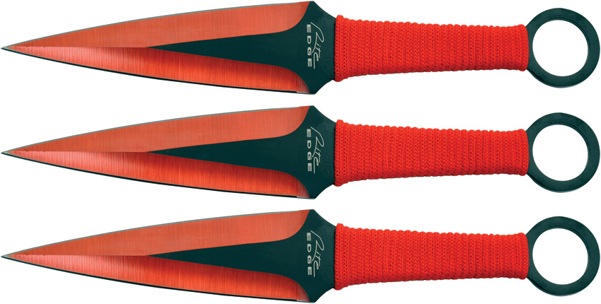 9″ (22.86cm) overall. 5″ (12.7cm) two-tone finish stainless blade. Red cord wrapped handle. Finger ring. Full, extended tang. Set of three. Black nylon belt sheath. Boxed.