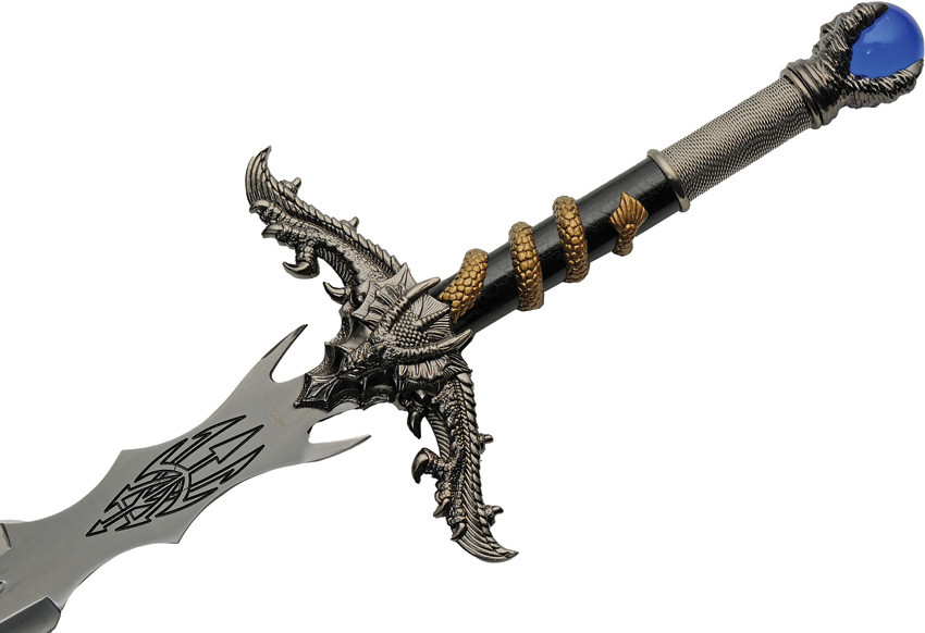 34″ (86.36cm) overall. 24″ (60.96cm) satin finish 420 stainless blade. Zinc handle. Blue orb dragon claw pommel. Dragon design guard. Includes wooden plaque. Boxed.