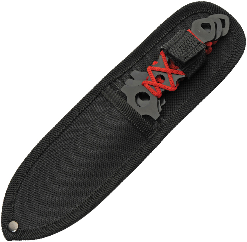7.5″ (19.05cm) overall. 4″ (10.16cm) black finish double edge 3Cr13 stainless dagger blade. Red cord wrapped handle. Full, extended tang. Lanyard hole. Black nylon belt sheath. Boxed.
