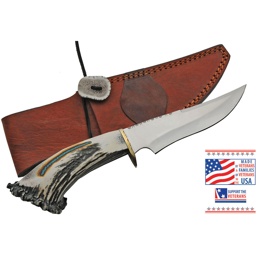 12″ (30.48cm) overall. 6.5″ (16.51cm) mirror finish stainless clip point blade. Elk stag handle with turquoise inlay. Brass guard. Brown leather belt sheath. Boxed.