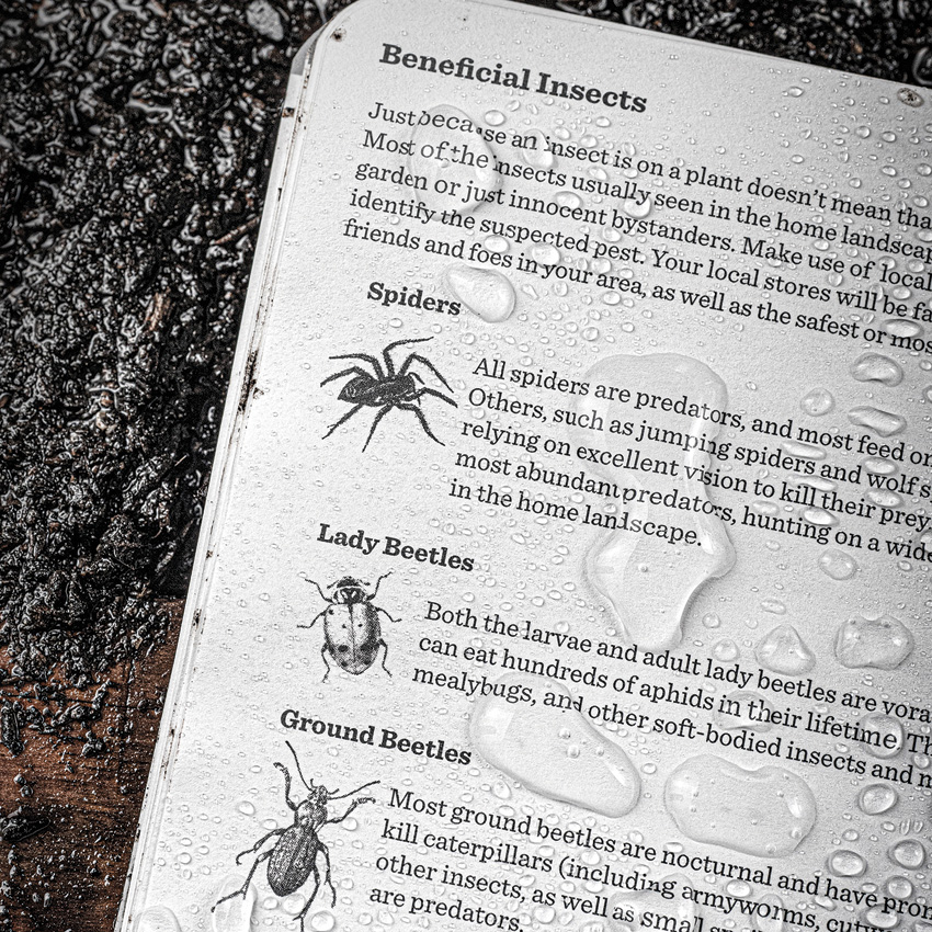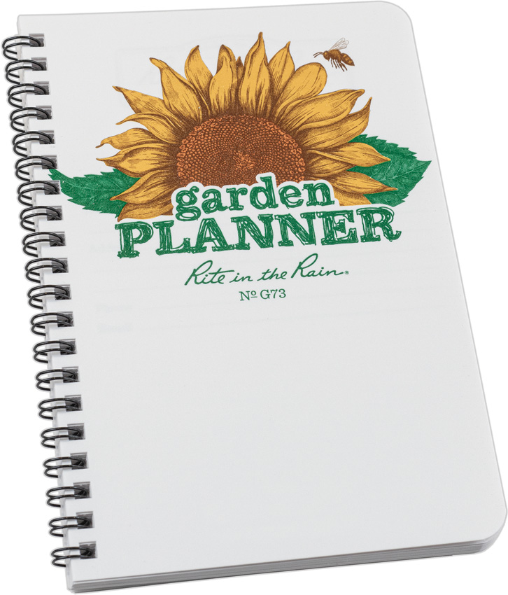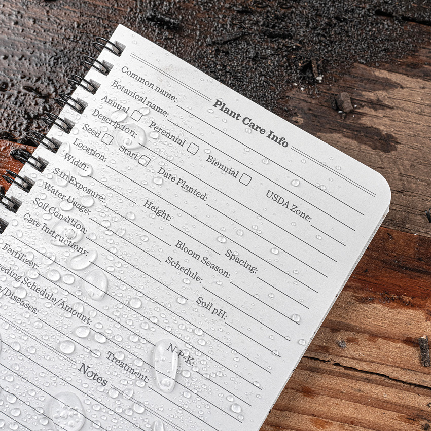 Dimensions: 4.63″ x 7″ x 0.38″. White polydura cover. Reference: Seasonal checklist, Plant care and layout, Soil pH levels. Wire-O binding. 64 pages, 32 sheets #32 dark gray Rite in the Rain paper with dot grid. Bulk packed.