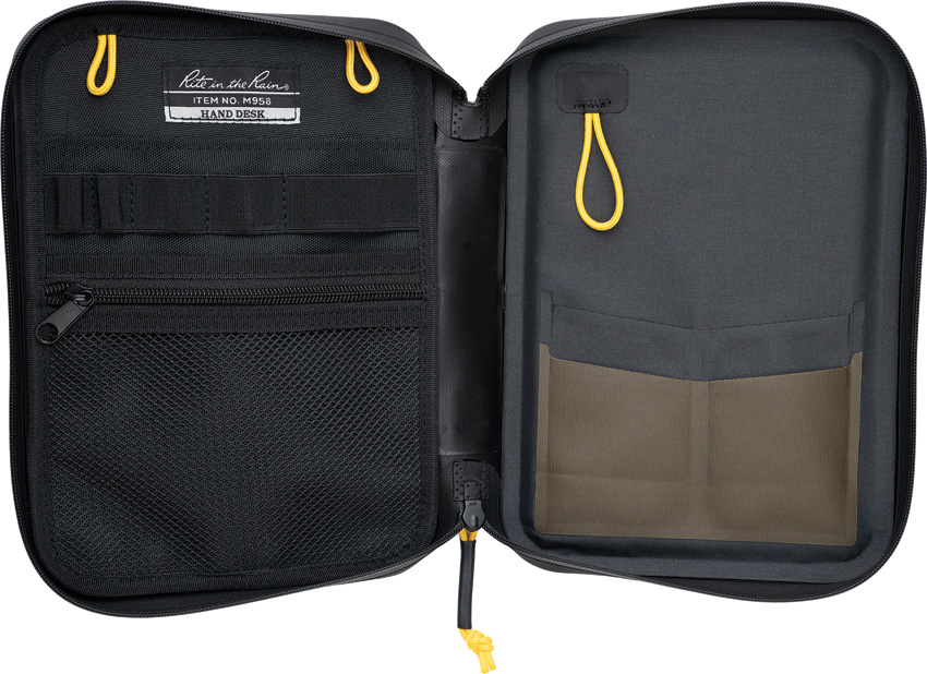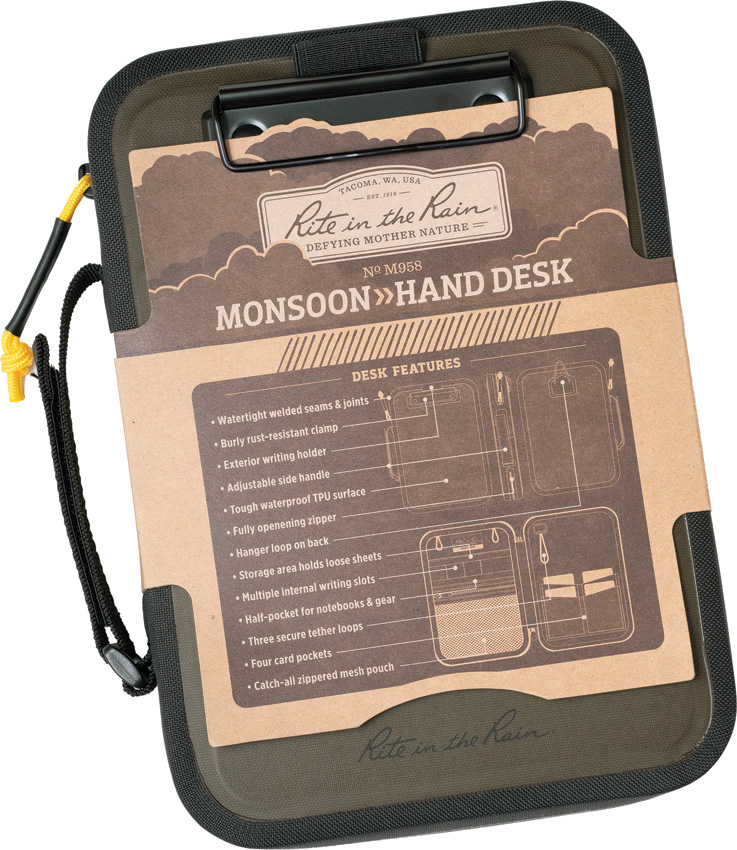 Dimensions: 9.5″ x 7″ x 1.75″. Watertight welded seams and joints. Burly rust-resistant clamp. Exterior writing holder. Adjustable side handle. Tough, waterproof TPU surface. Fully opening zipper. Hanger loop on back. Storage area holds loose sheets. Multiple internal writing slots. Half-pocket for notebooks and gear. Three secure tether loops. Four card pockets. Catch-all zippered mesh pouch. Bulk packed.