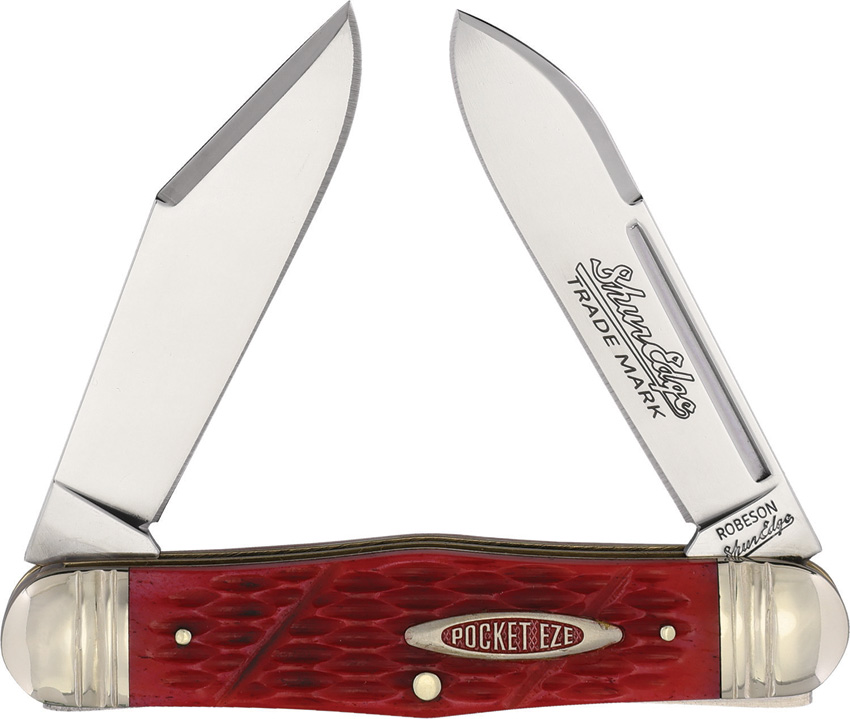 3.63″ (9.22cm) closed. Mirror finish stainless clip and spear blades. Red jigged bone handle. Nickel silver bolster(s). Inlay shield. Boxed.