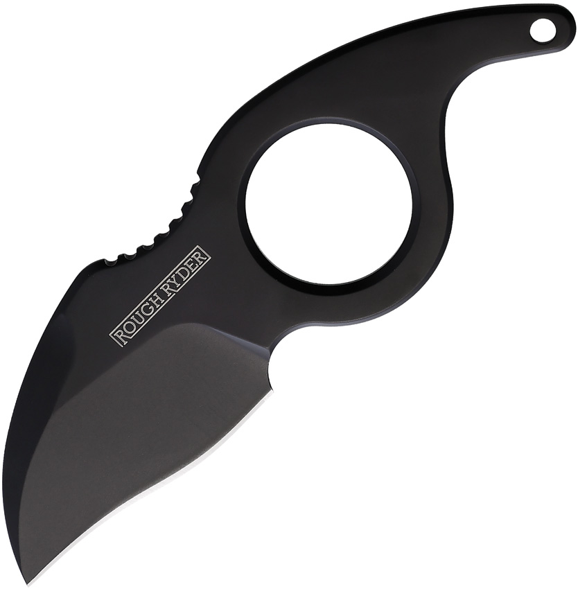 Code Red. 5″ (12.7cm) overall. 2″ (5.08cm) black finish stainless blade. One-piece construction. Finger ring. Lanyard hole. Red Kydex neck sheath. Boxed.