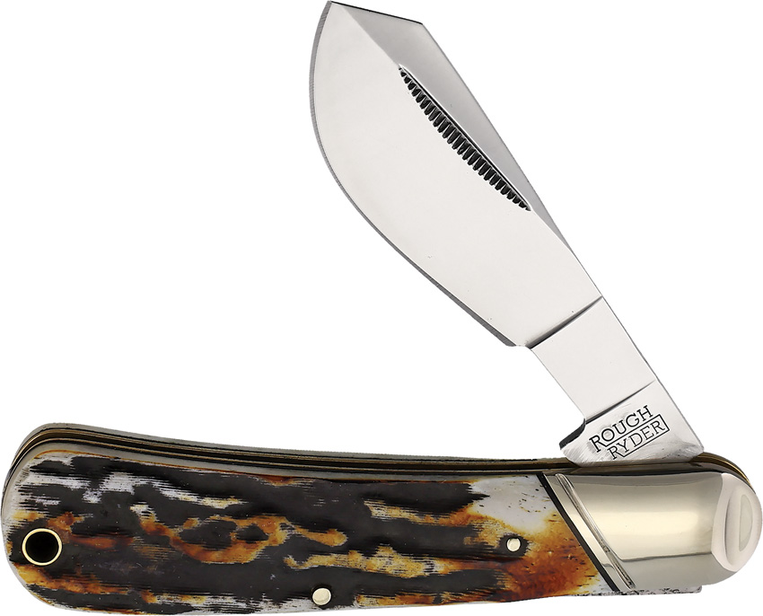 Cinnamon Bone Stag. 4.13″ (10.49cm) closed. Mirror finish carbon steel wide belly blade. Cinnamon stag bone handle. Nickel silver bolster(s). Lanyard hole. Boxed.