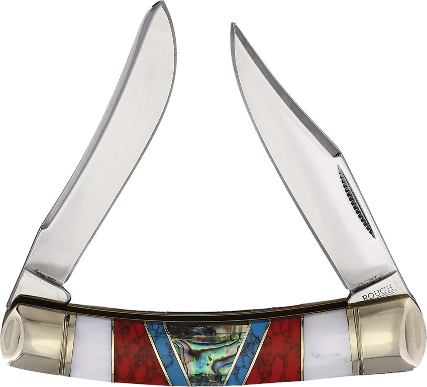 3.5″ (8.89cm) closed. Mirror finish stainless clip and long spey blades. Nickel silver bolster(s). Red and blue turquoise, Mother of Pearl, and abalone handle. Boxed.