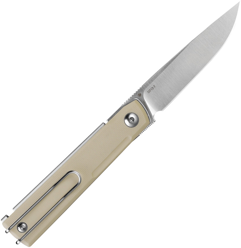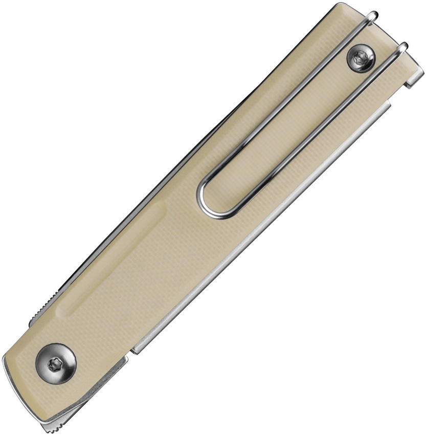 4″ (10.16cm) closed. 3″ (7.62cm) satin finish 8Cr13MoV stainless drop point blade. Tan G10 handle. Extended tang. Pocket clip. Boxed.