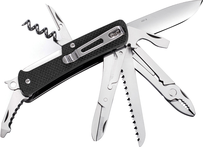 3.75″ (9.53cm) closed. 12C27 Sandvik stainless blade. Black G10 handle. Tools include: Large blade l Glass breaker l Pocket clip l Tweezers l Bottle opener l Corkscrew l Large screwdriver l Wire stripper l Belt/cord cutter l Small screwdriver l Keyring l Scissors l Reamer with sewing eye l Pliers l Wire cutter l Saw blade I Drill I Facer I Fishing line pliers. Boxed.