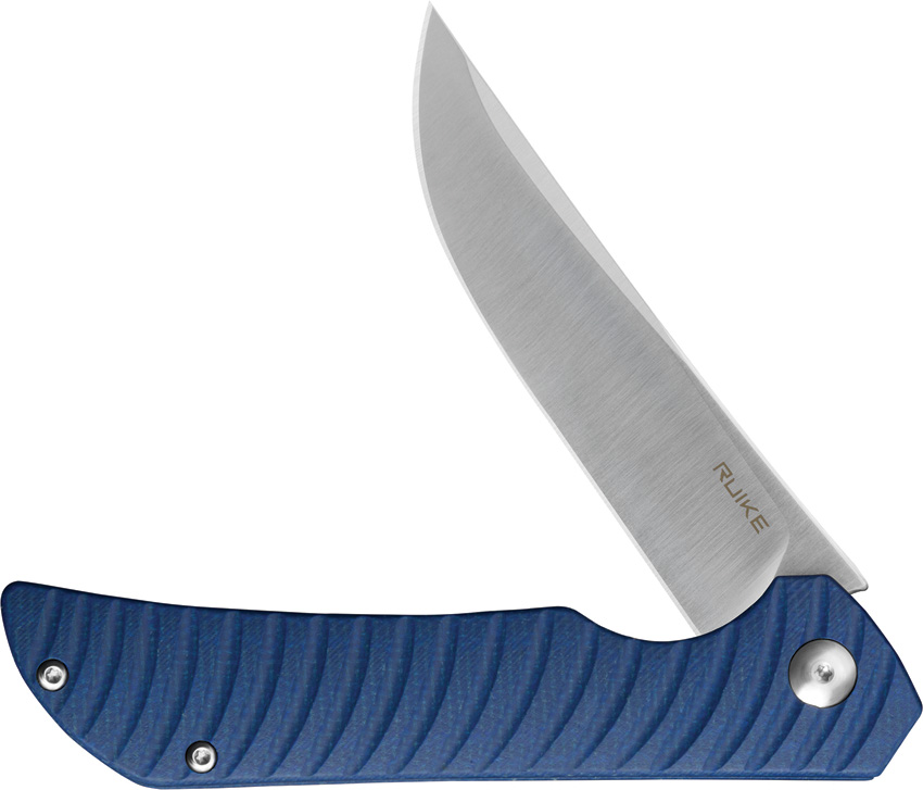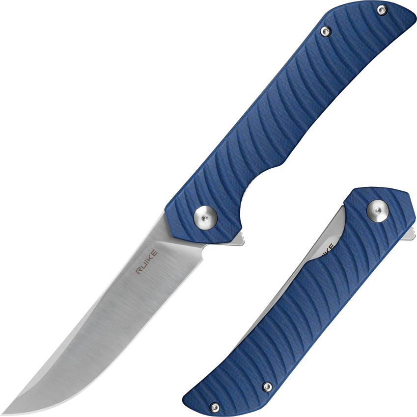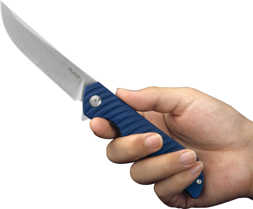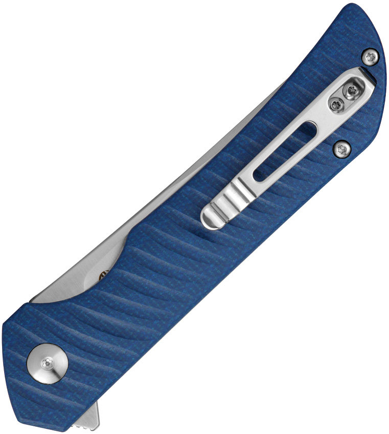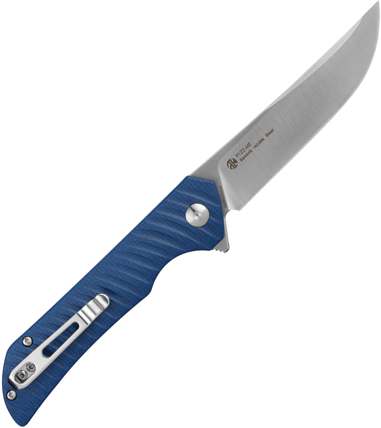 4.75″ (12.07cm) closed. 3.75″ (9.53cm) satin finish 14C28N Sandvik stainless blade. Blue sculpted micarta handle. Extended tang. Pocket clip. Boxed.
