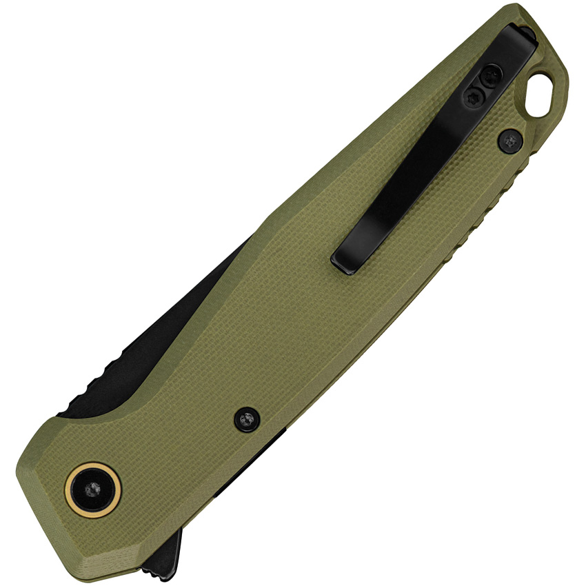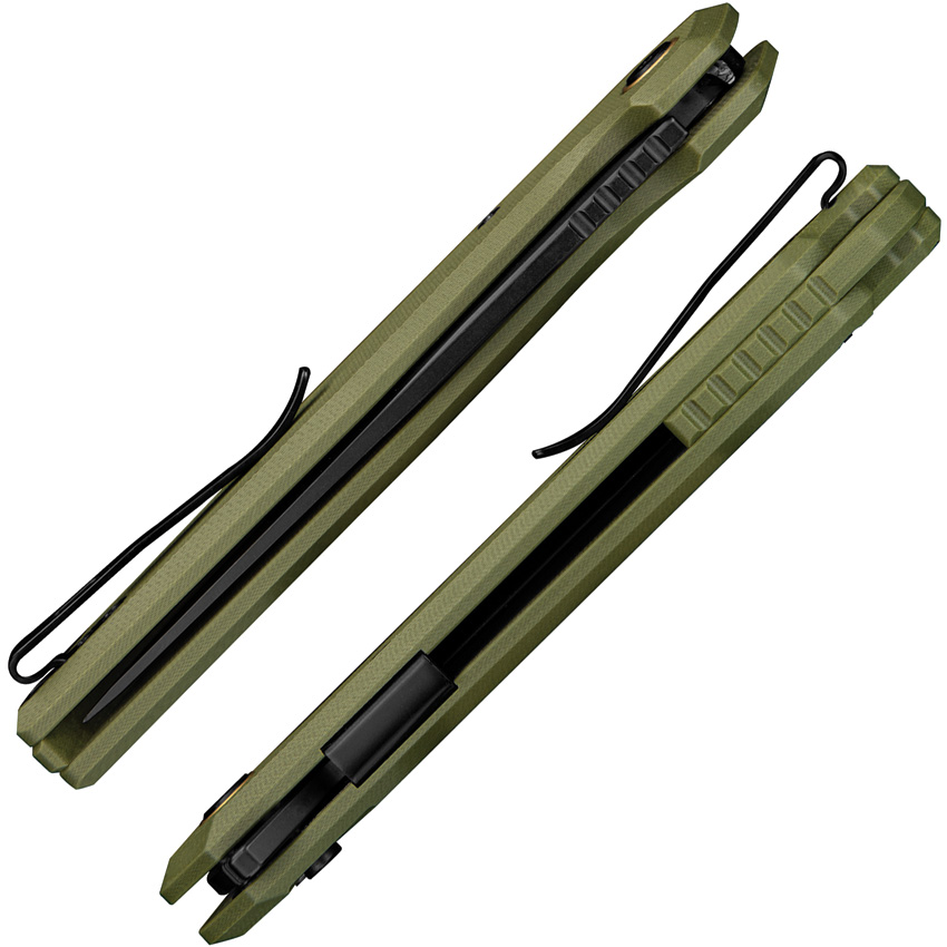 4.63″ (11.76cm) closed. 3.5″ (8.89cm) black stonewash finish 14C28N Sandvik stainless blade. OD green G10 handle. Extended tang. Lanyard hole. Pocket clip. Boxed.