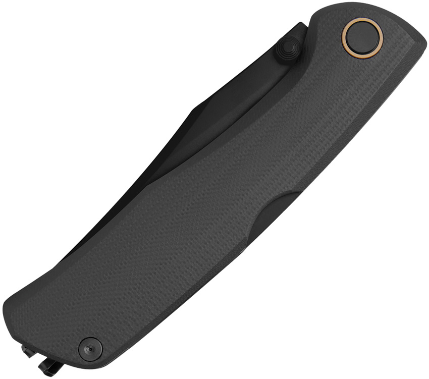 4.25″ (10.8cm) closed. 3.25″ (8.26cm) black finish 12C27 Sandvik stainless blade. Black G10 handle. Thumb stud. Pocket clip. Boxed.