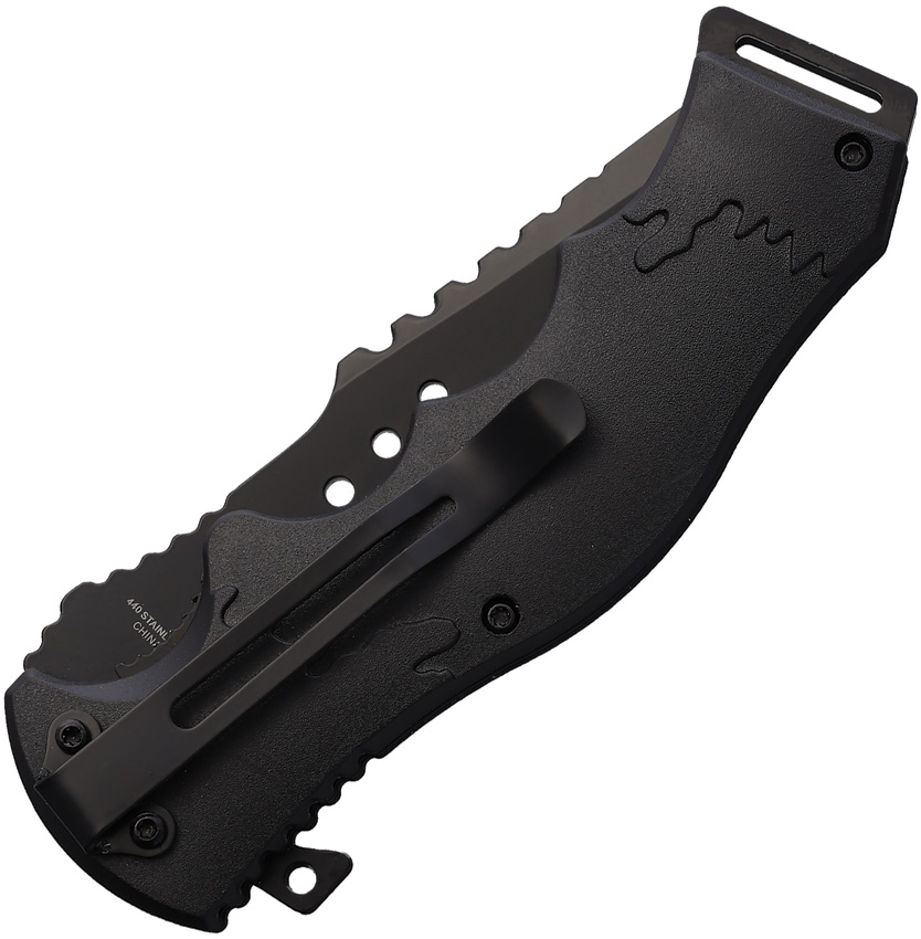 Assisted opening. 4.75″ (12.07cm) closed. 3.75″ (9.53cm) black finish partially serrated stainless blade. Synthetic handle. Extended tang. Lanyard hole. Pocket clip. Whitetail deer handle artwork. Boxed.