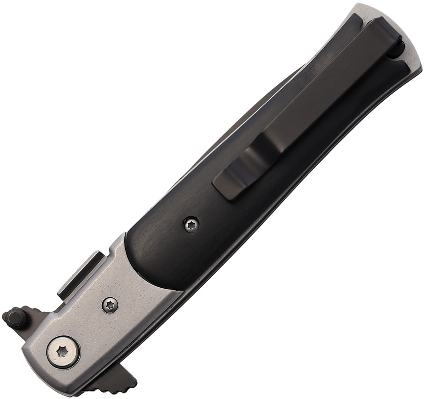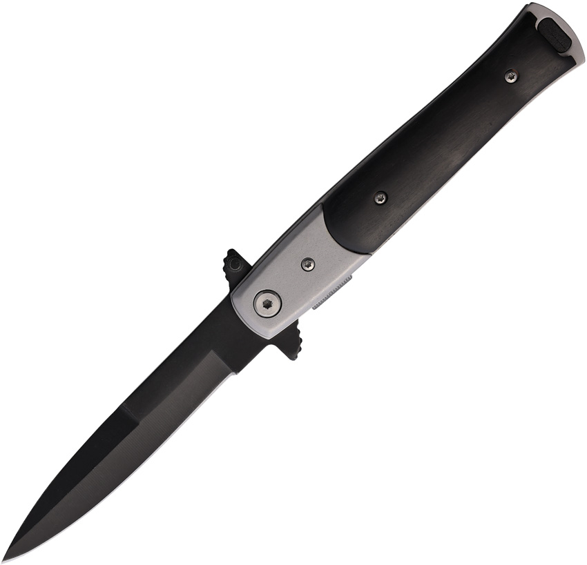 4.88″ (12.4cm) closed. 3.75″ (9.53cm) black finish stainless spear point blade. Black wood handle. Stainless bolster(s). Extended tang. Thumb stud. Lanyard hole. Pocket clip. Boxed.
