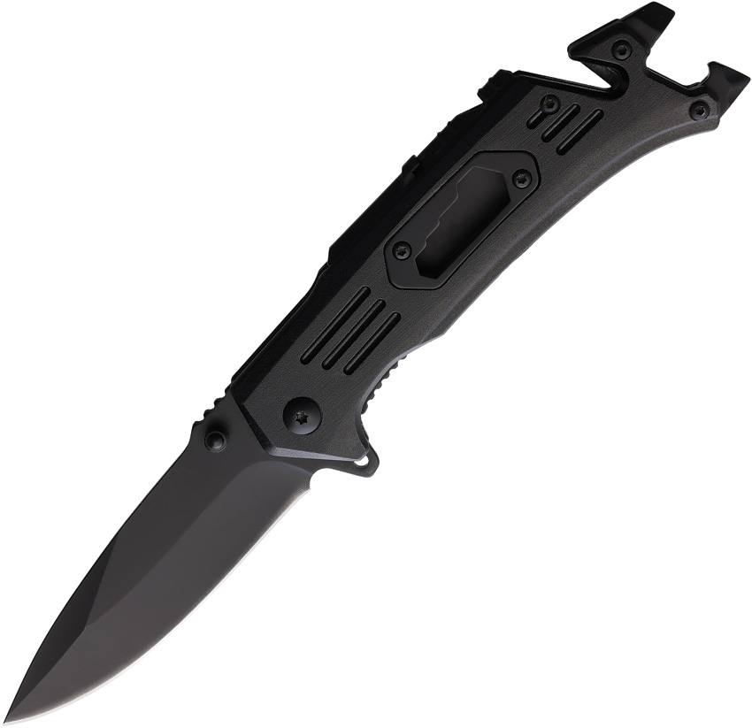 Assisted opening. 4.88″ (12.4cm) closed. 3.5″ (8.89cm) black finish stainless blade. Black aluminum handle. Belt/cord cutter. Blade etching. Extended tang. Glass breaker. Pocket clip. Thumb stud. Integrated Hex driver. Boxed.
