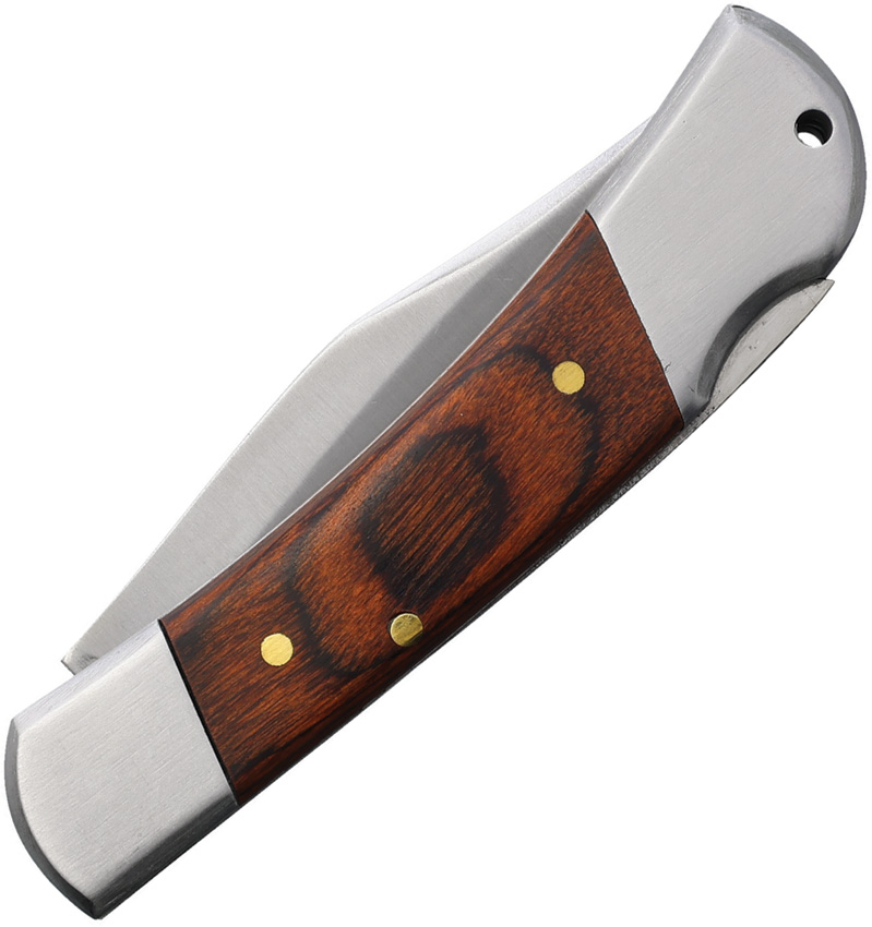 3.25″ (8.26cm) closed. 2.25″ (5.72cm) satin finish stainless clip point blade. Brown wood handle. Stainless bolster(s). Lanyard hole. Boxed.
