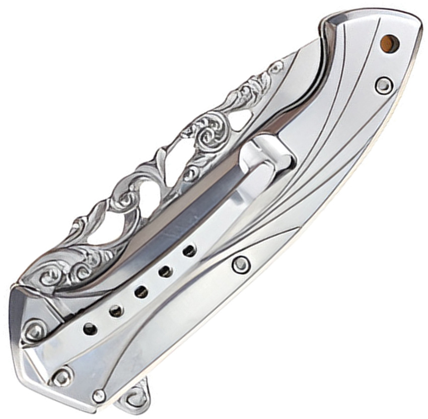 Assisted opening. 4.63″ (11.76cm) closed. 3.25″ (8.26cm) satin finish stainless blade. Sculpted stainless handle with Duck synthetic onlay. Extended tang. Pocket clip. Boxed.