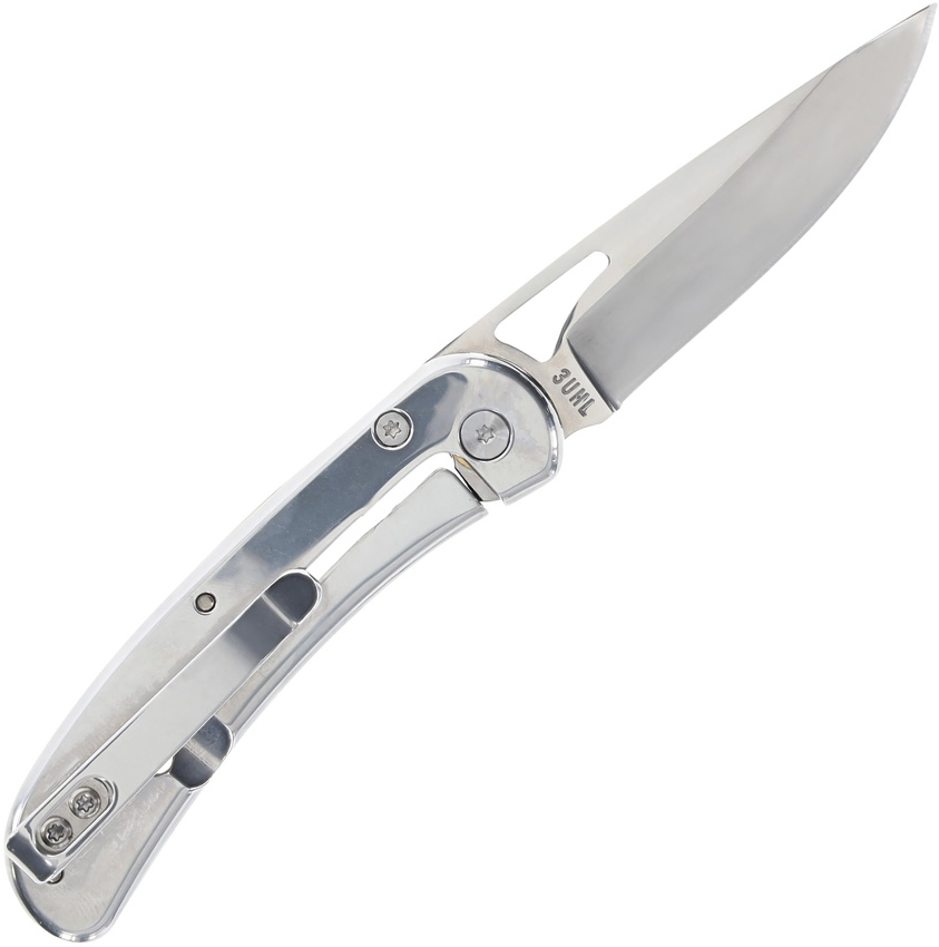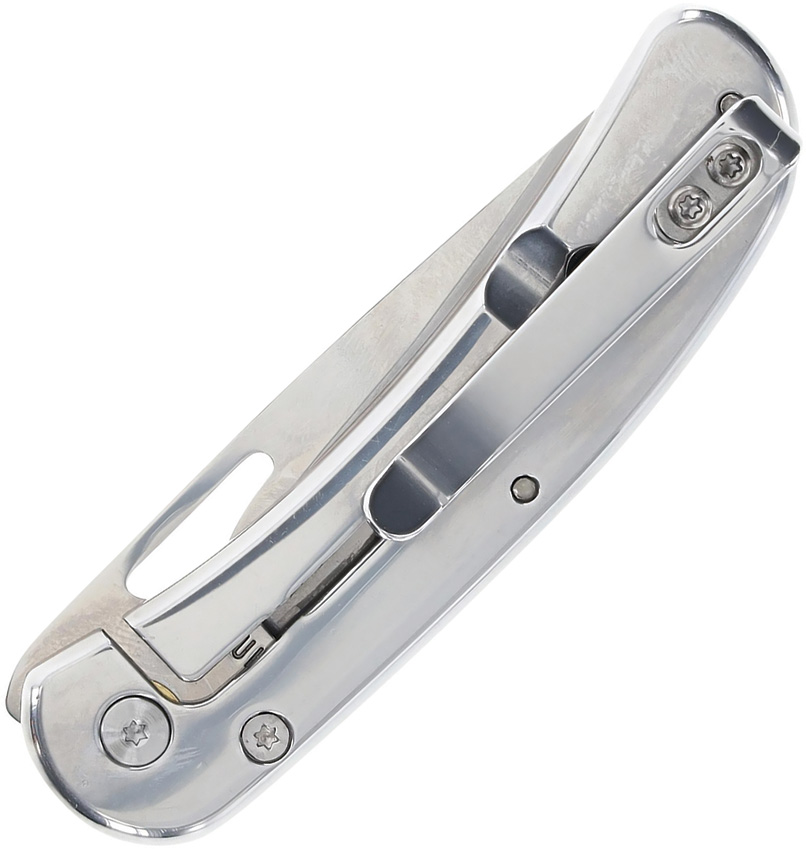 3.5″ (8.89cm) closed. 2.5″ (6.35cm) mirror finish stainless drop point blade. Delrin handle with stainless back handle. Thumb pull. Pocket clip. Boxed.