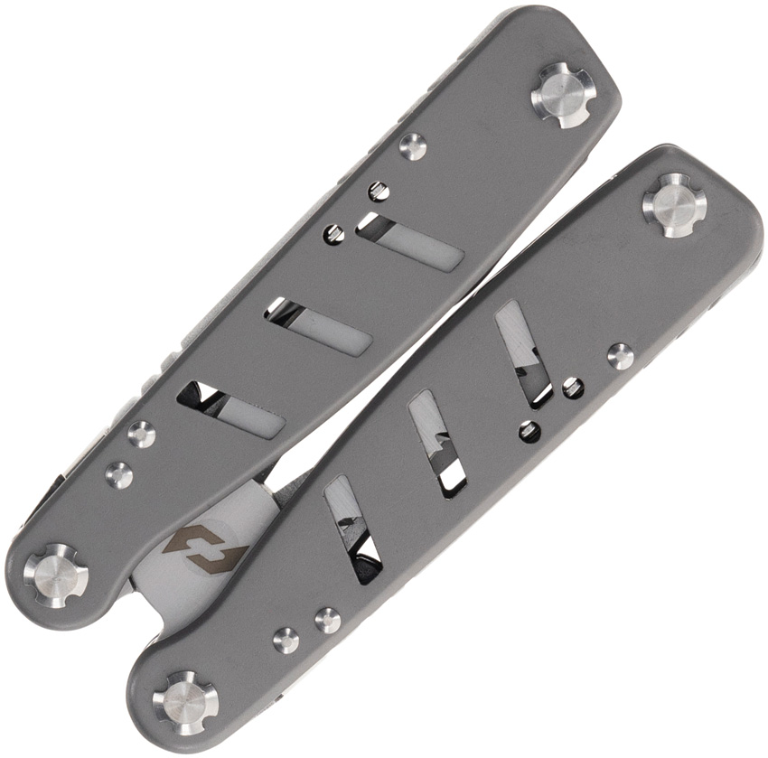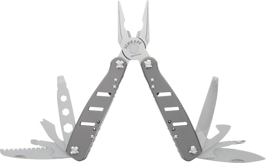 6.5″ overall. Gray stainless handles. Tools include: Pliers l Needlenose pliers l Wire cutter l Large blade l Phillips screwdriver l Can opener l Ruler l File l Wrench l Small screwdriver l Large screwdriver l Bottle opener l Nail puller l Saw blade l Flat head screwdriver l Hex/Bit driver. Spring loaded components. Clam packed.