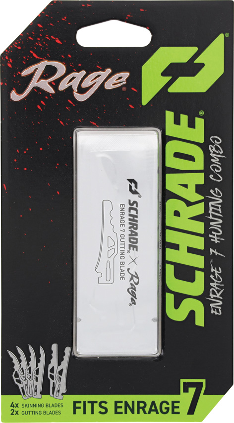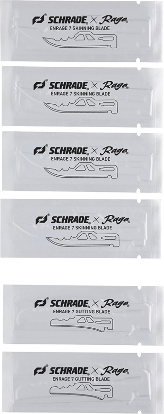 2.6″ (6.6cm) blade. Includes: (4) Skinning blades; (2) Gutting blades. For use with Schrade Enrage 7 knives. Clam packed.