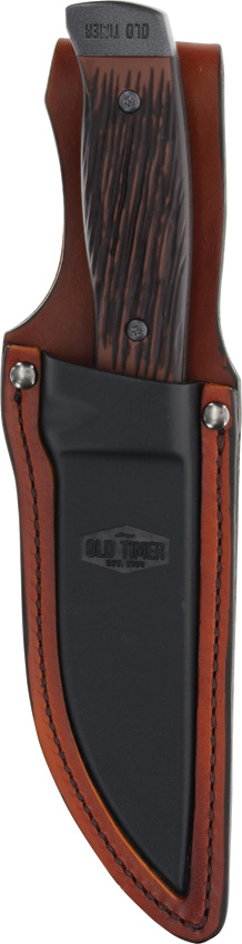 9.75″ (24.77cm) overall. 5″ (12.7cm) gray coated stainless blade. Gray stainless handle with Delrin inlay. Full tang. Brown leather and FRN belt sheath. Boxed.