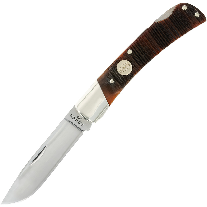 Old Timer. 3.75″ (9.53cm) closed. Mirror finish 1095HC steel drop point blade. Brown sawcut bone handle. Nickel silver bolster(s). Inlay shield. Boxed with hanging tab.