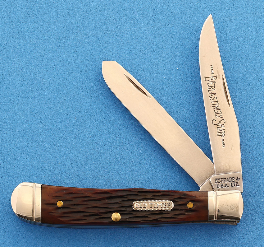 Schrade Old Timer Classic. Model OTC96. 4 1/8” closed 2 blade trapper. Stainless clip point and long spey blades. Master blade etched Everlastingly Sharp. Brown jigged bone handles with ribbed Old Timer inlay shield. Grooved nickel silver bolsters. Comes in gift tin with vacuum formed insert and enamel hat pin. Earlier model produced in Ellenville, N.Y.