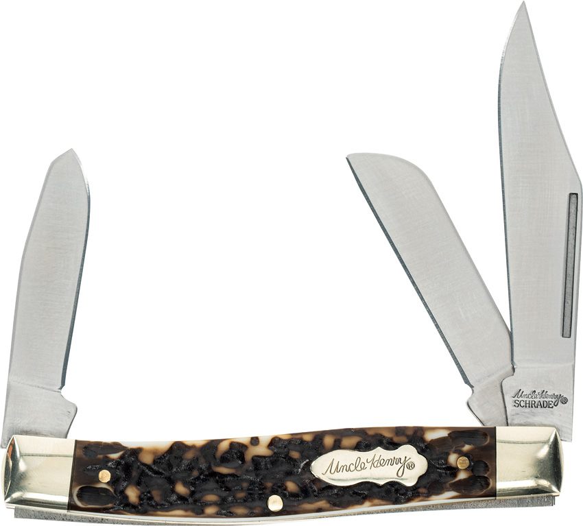 Uncle Henry. 4.25″ (10.8cm) closed. Satin finish stainless clip, sheepsfoot, and spey blades. Staglon handle. Nickel silver bolster(s). Inlay shield. Boxed.