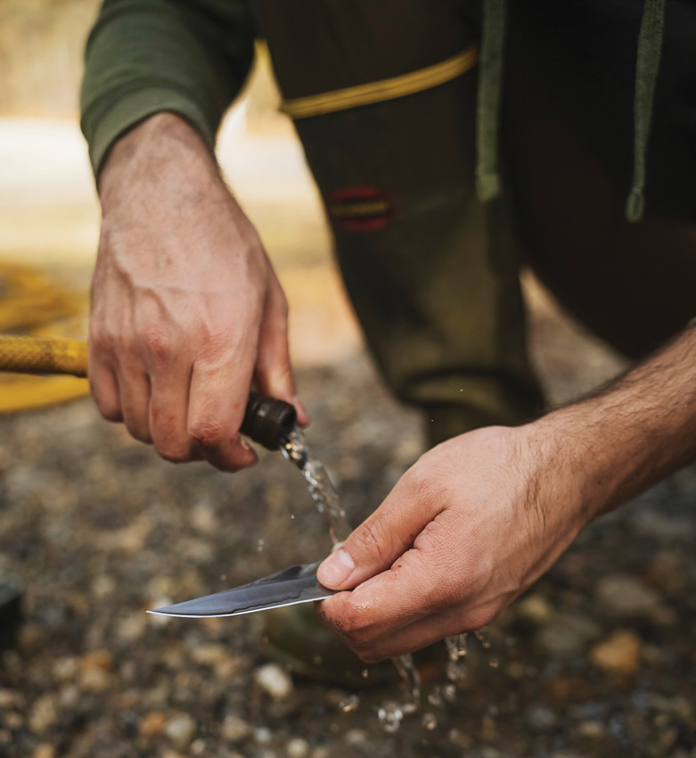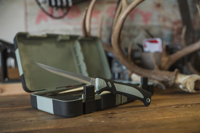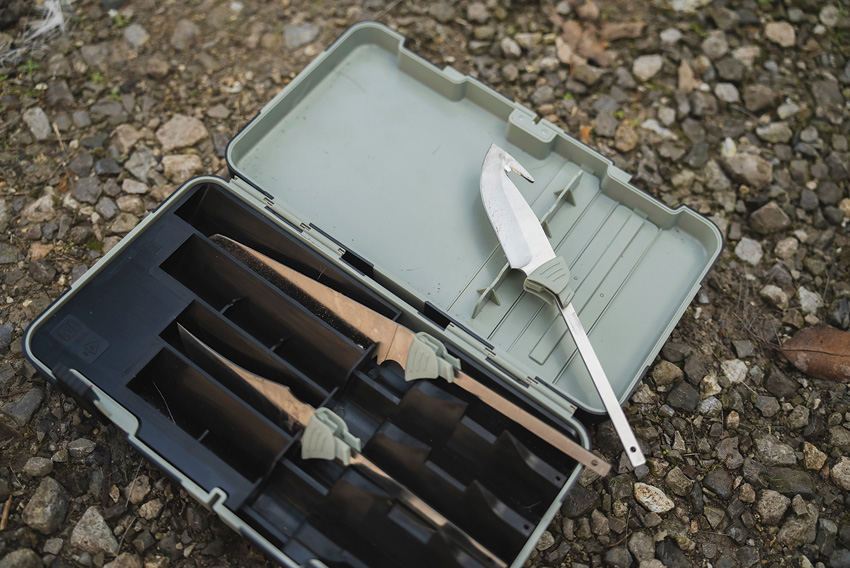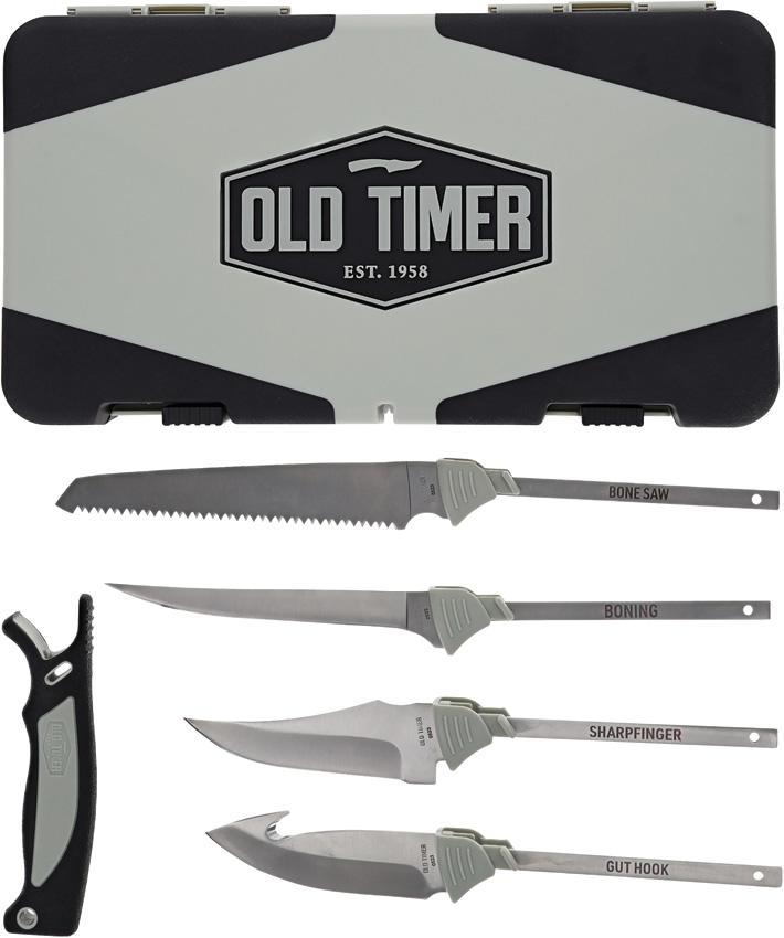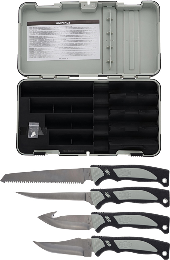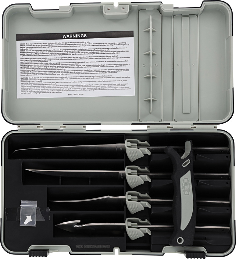 Includes: 6″ Bone saw blade; 5.25″ Boning blade; 4″ Sharpfinger skinner blade; 3.75″ Guthook blade. 5.25″ handle with rubber grip. Dishwasher safe case with knife sharpener.