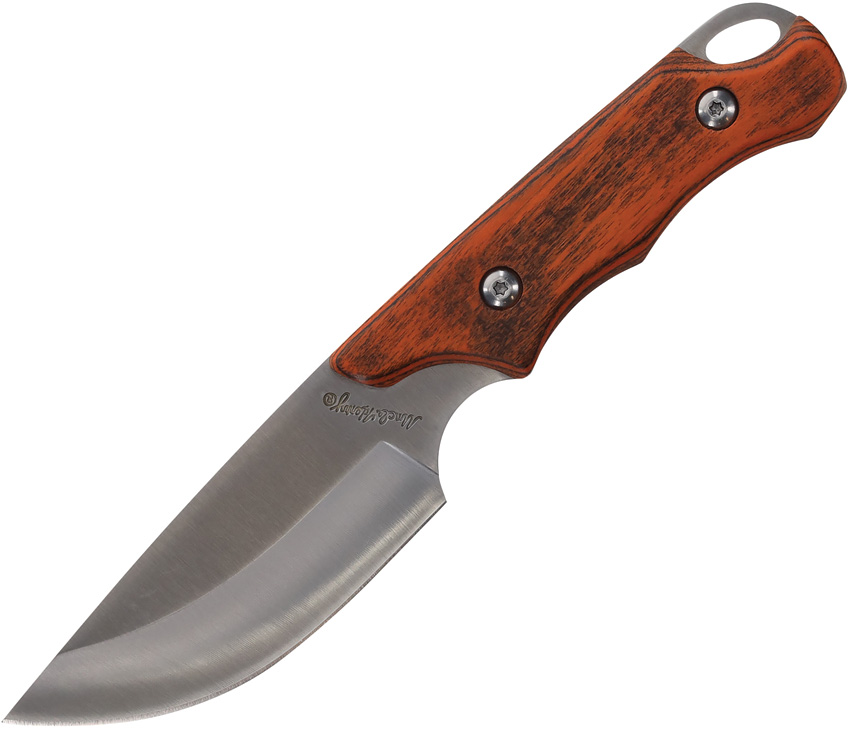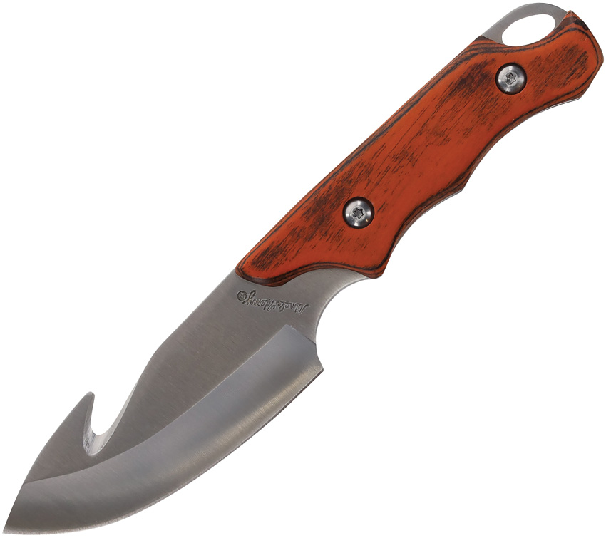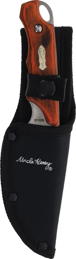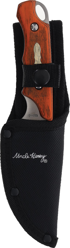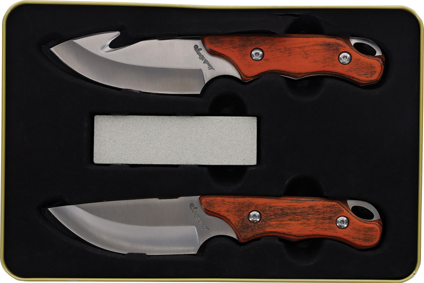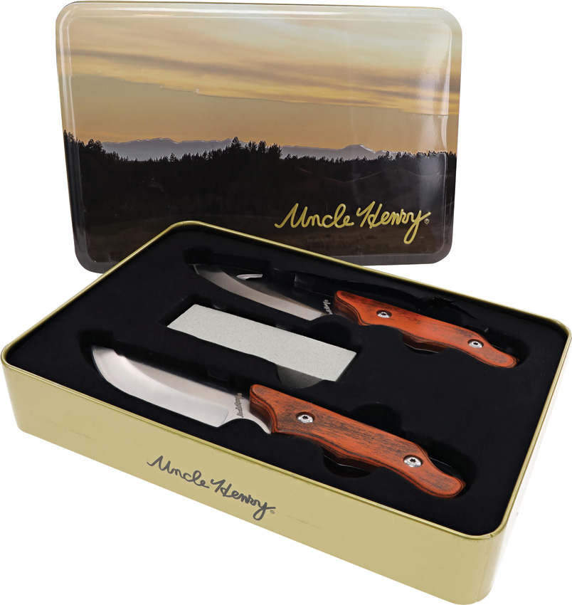Uncle Henry. Satin finish stainless blade. Brown wood handle. Full tang. Lanyard hole. Includes: 7.75″ overall hunter with 3.5″ blade; 7.75″ overall guthook with 3.5″ blade; 3.5″ x 1″ sharpening stone; Gift tin. Clam packed.