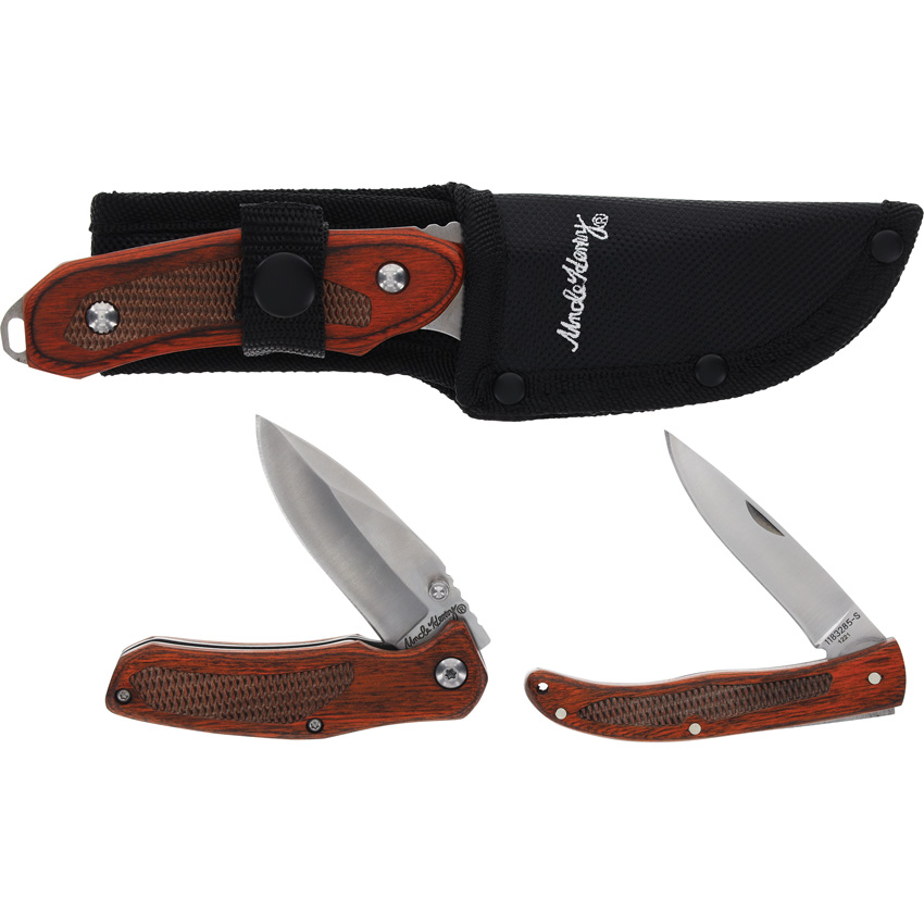 Uncle Henry. Satin finish stainless blade. Brown checkered wood handle. Includes: 7.5″ overall fixed blade with 3.25″ blade, full tang and lanyard hole; 3.5″ closed linerlock with 2.5″ blade and thumb stud; 3.5″ closed folder with 2.5″ blade and lanyard hole. Black nylon belt sheath. Clam packed.