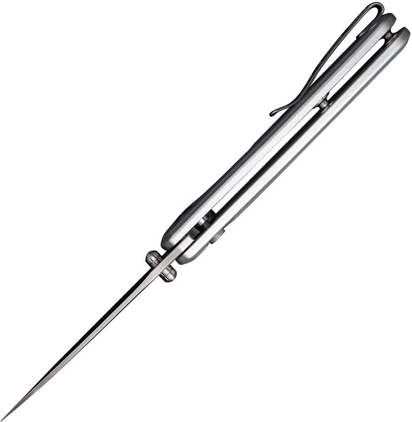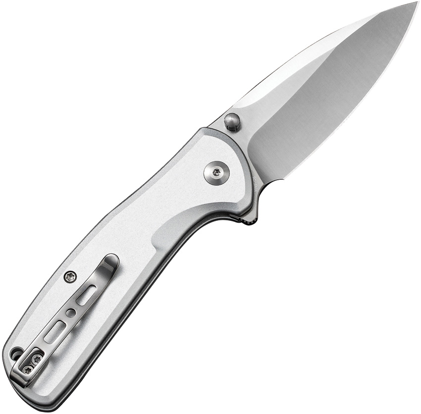 4″ (10.16cm) closed. 3″ (7.62cm) satin finish 9Cr18MoV stainless blade. Silver aluminum handle. Extended tang. Thumb stud. Lanyard hole. Pocket clip. Boxed.