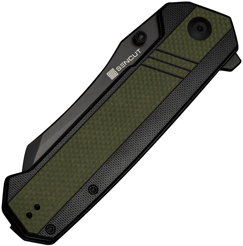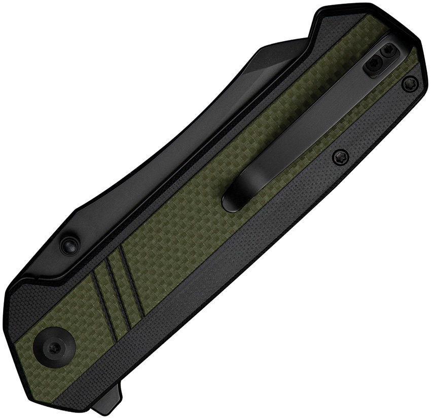 5″ (12.7cm) closed. 3.75″ (9.53cm) black finish 9Cr18MoV stainless sheepsfoot blade. Black and green G10 handle. Extended tang. Thumb stud. Pocket clip. Black nylon zippered storage case. Boxed.