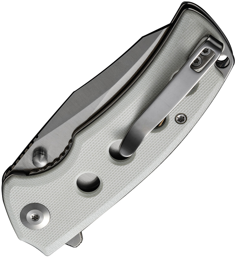 4″ (10.16cm) closed. 3″ (7.62cm) satin finish 9Cr18MoV stainless blade. White G10 handle. Thumb stud. Extended tang. Lanyard hole. Pocket clip. Reverse tanto blade. Black nylon zippered storage case. Boxed.