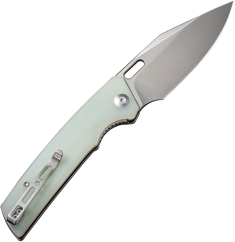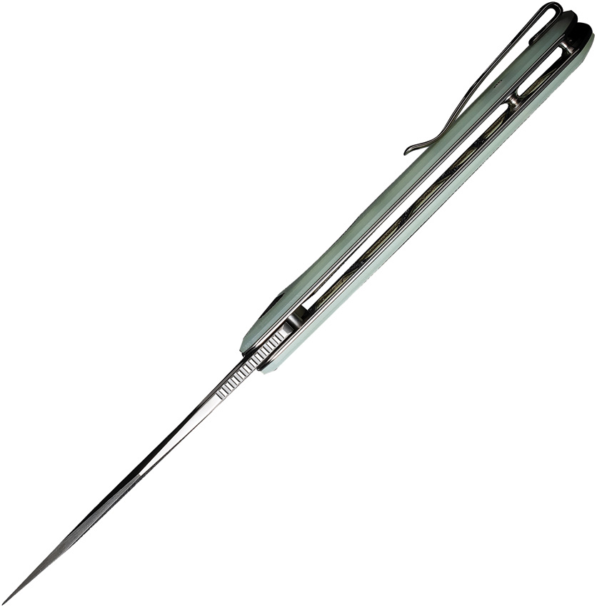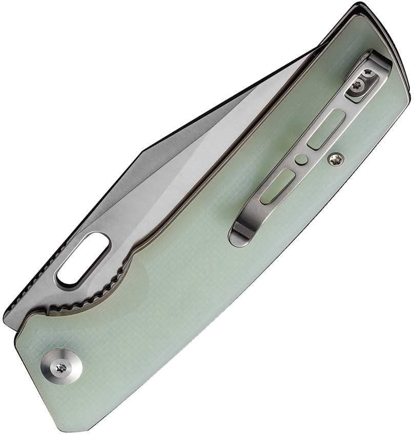4.75″ (12.07cm) closed. 3.75″ (9.53cm) satin finish 9Cr18MoV stainless blade. Jade G10 handle. Thumb pull. Pocket clip. Black nylon zippered storage case. Boxed.