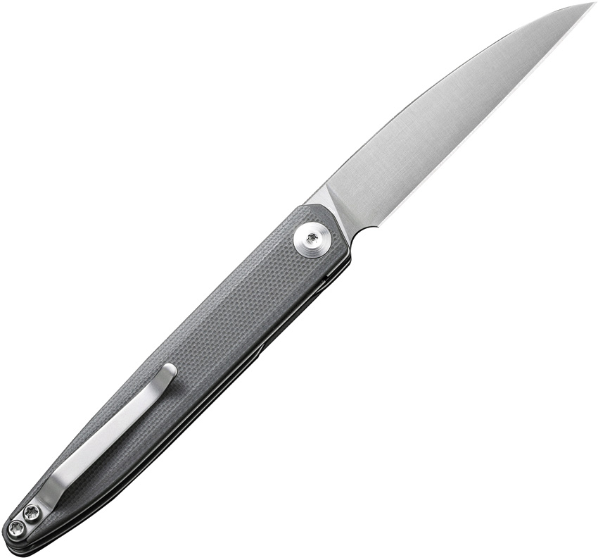 3.88″ (9.86cm) closed. 3″ (7.62cm) satin finish D2 tool steel Wharncliffe blade. Gray G10 handle. Extended tang. Pocket clip. Black nylon zippered storage case. Boxed.