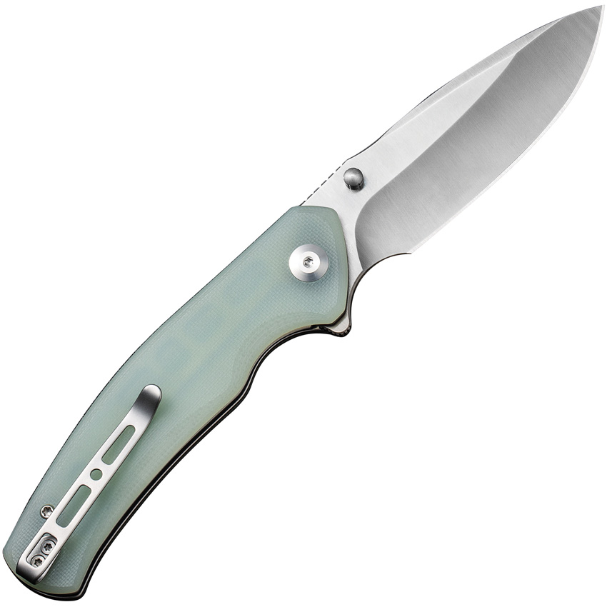 4.5″ (11.43cm) closed. 3.5″ (8.89cm) satin finish D2 tool steel blade. Jade G10 handle. Extended tang. Thumb stud. Pocket clip. Black nylon belt sheath. Boxed.