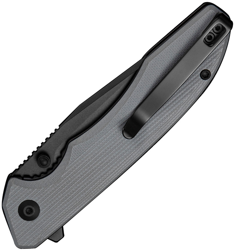 4.63″ (11.76cm) closed. 3.38″ (8.59cm) black finish D2 tool steel clip point blade. Gray G10 handle. Extended tang. Thumb stud. Pocket clip. Black nylon zippered storage case. Boxed.