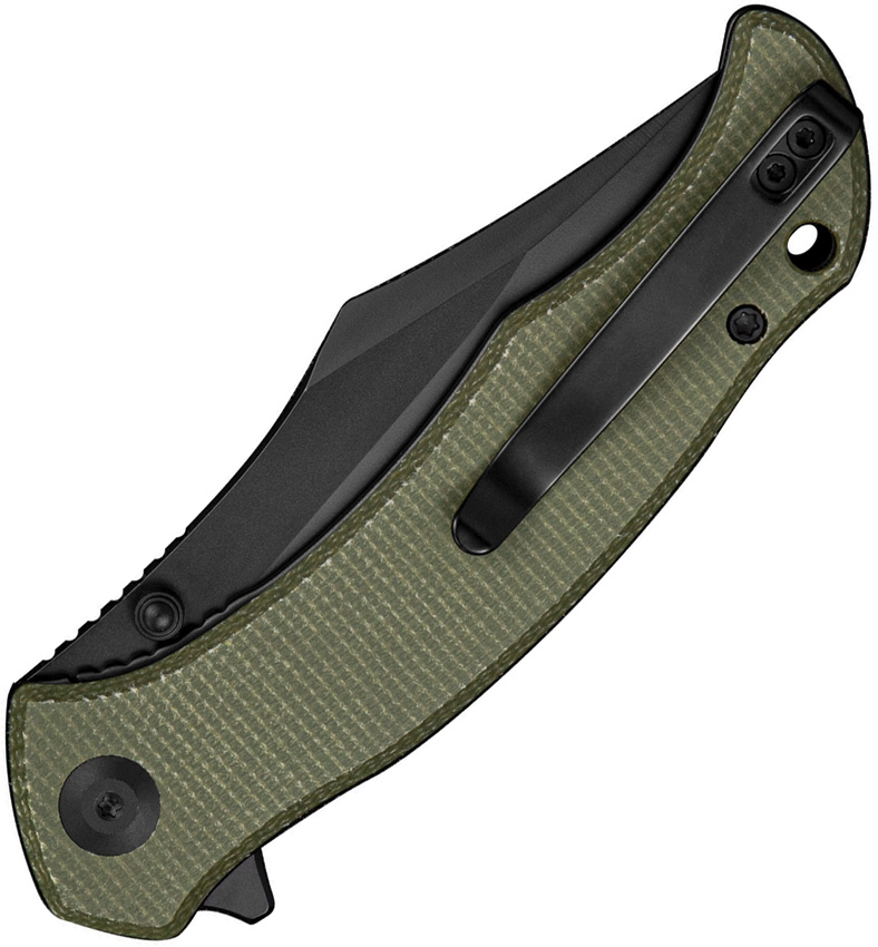 4.5″ (11.43cm) closed. 3.5″ (8.89cm) black finish D2 tool steel clip point blade. Olive canvas micarta handle. Extended tang. Thumb stud. Lanyard hole. Pocket clip. Black nylon zippered storage case. Boxed.